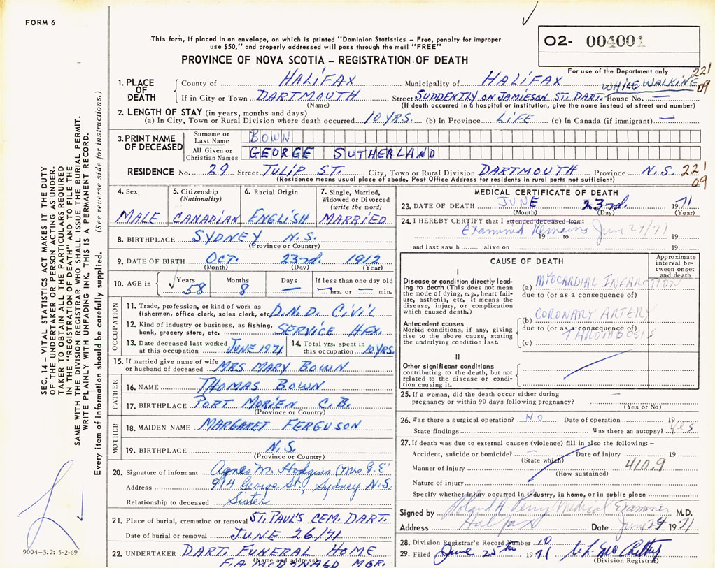 PROVINCE OF NOVA SCOTIA — REGISTRATION OF DEATH