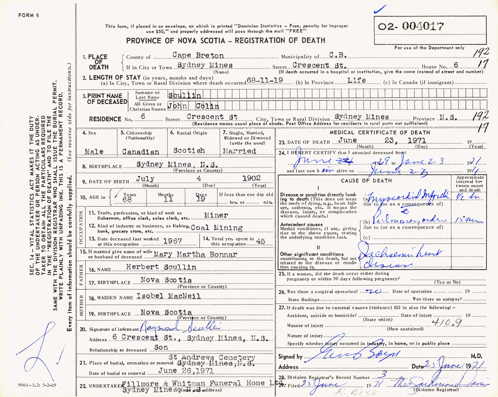 1. PLACE OF DEATH County of Cape Breton If in City or Town Sydney Mines