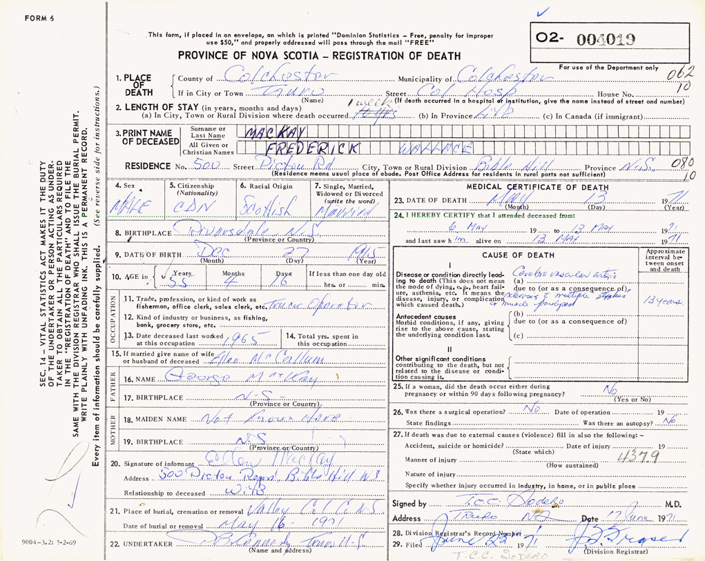 PROVINCE OF NOVA SCOTIA — REGISTRATION OF DEATH