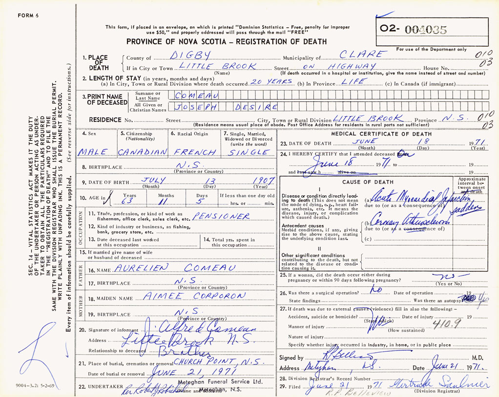 3. PRINT NAME OF DECEASED Comeau, Joseph Desire