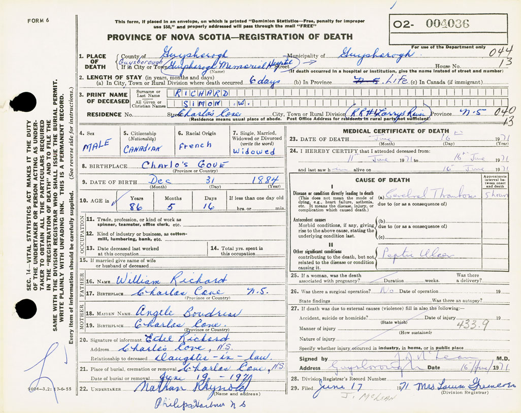 21. Place of burial Charlos Cove, NS