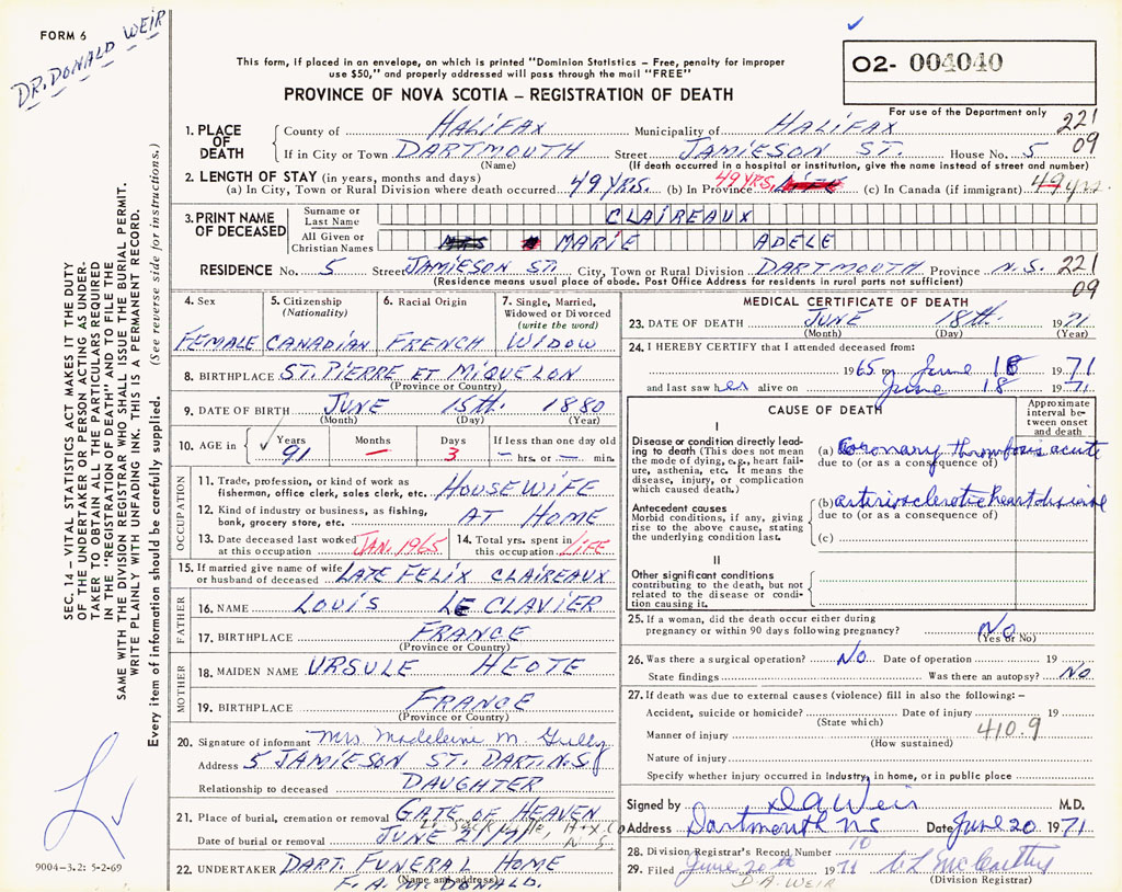 PROVINCE OF NOVA SCOTIA — REGISTRATION OF DEATH