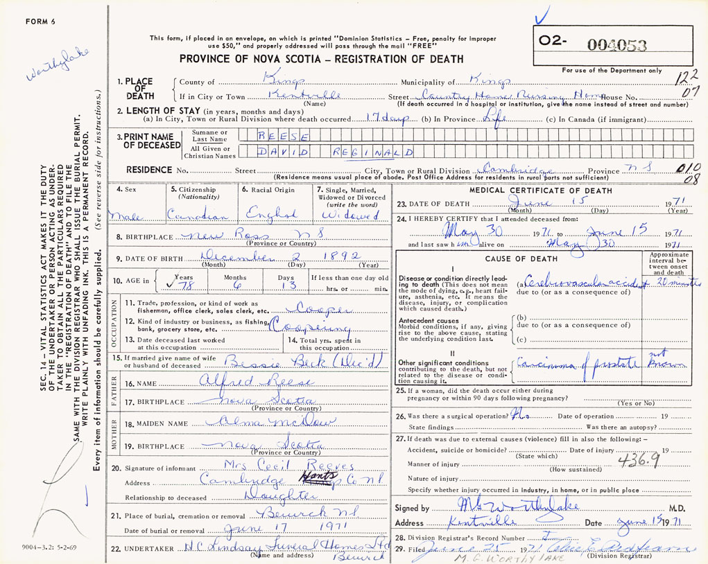 PROVINCE OF NOVA SCOTIA — REGISTRATION OF DEATH