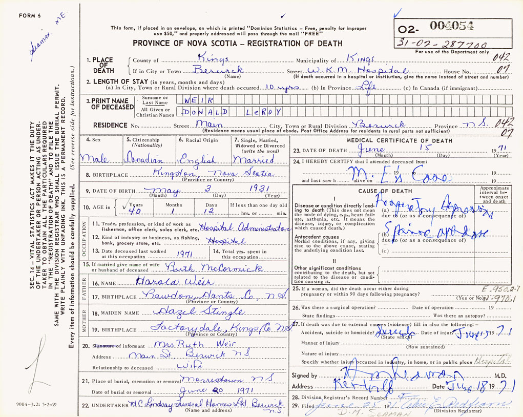 PROVINCE OF NOVA SCOTIA — REGISTRATION OF DEATH