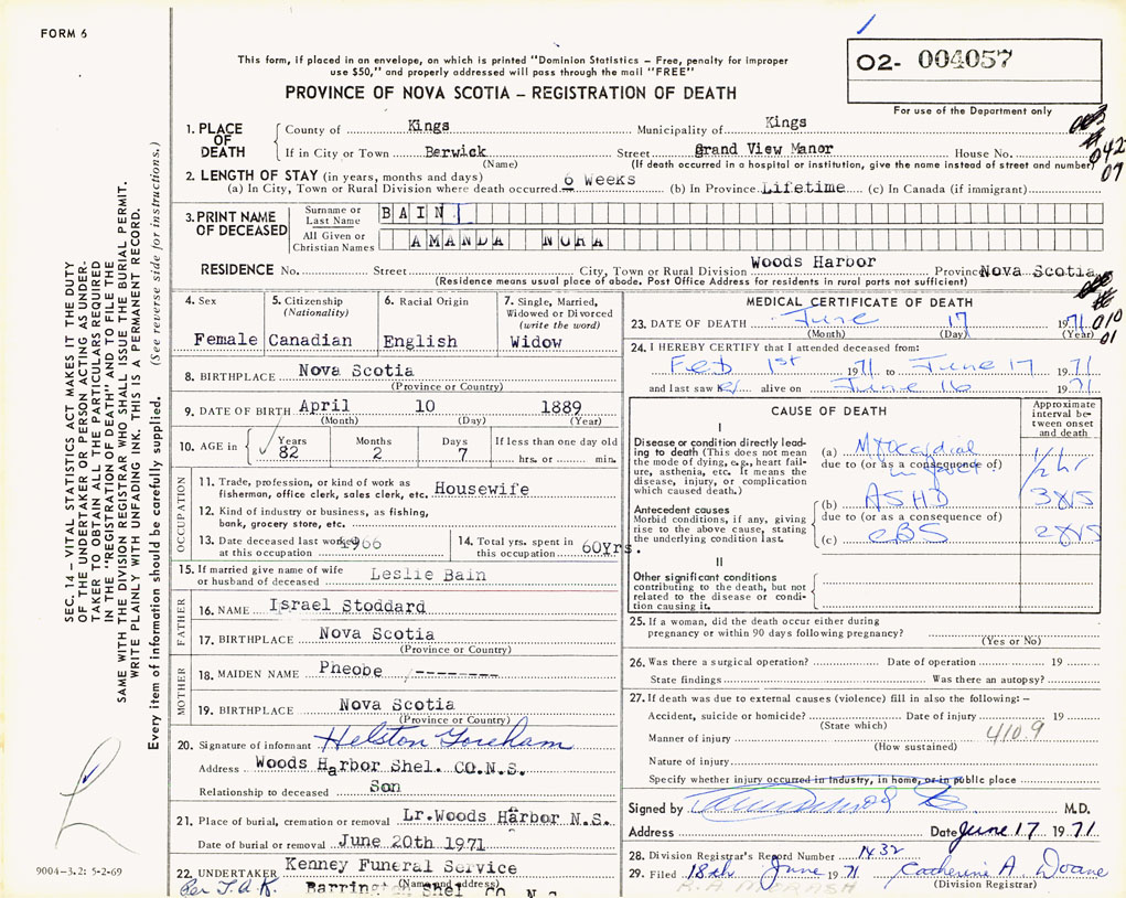PROVINCE OF NOVA SCOTIA — REGISTRATION OF DEATH