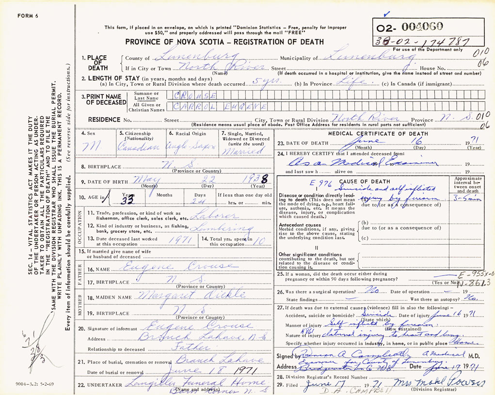 PROVINCE OF NOVA SCOTIA — REGISTRATION OF DEATH