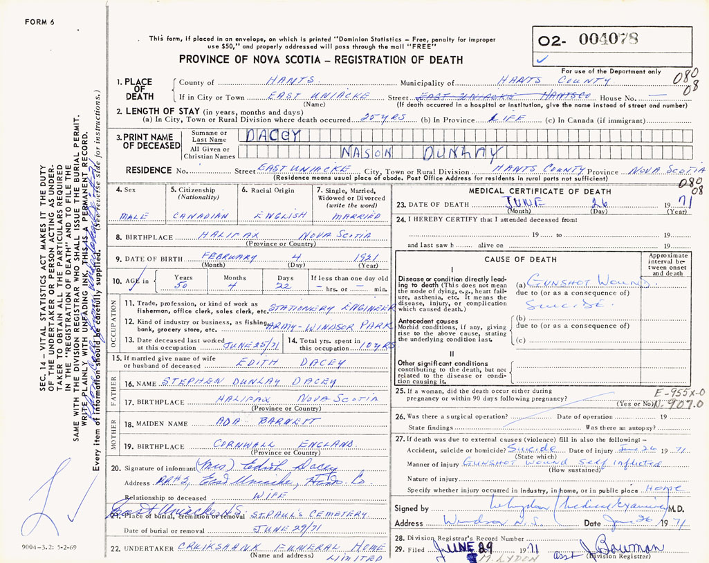 PROVINCE OF NOVA SCOTIA — REGISTRATION OF DEATH
