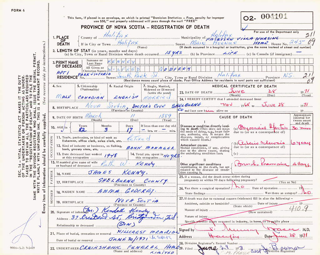 PROVINCE OF NOVA SCOTIA — REGISTRATION OF DEATH