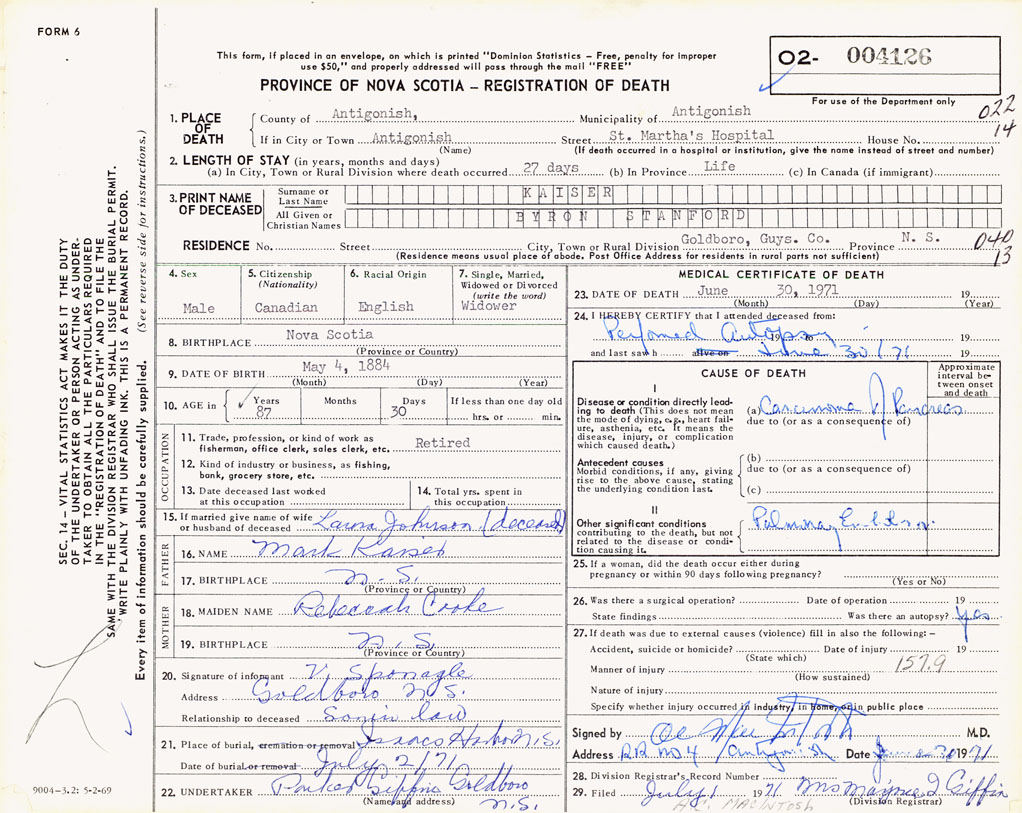 PROVINCE OF NOVA SCOTIA — REGISTRATION OF DEATH