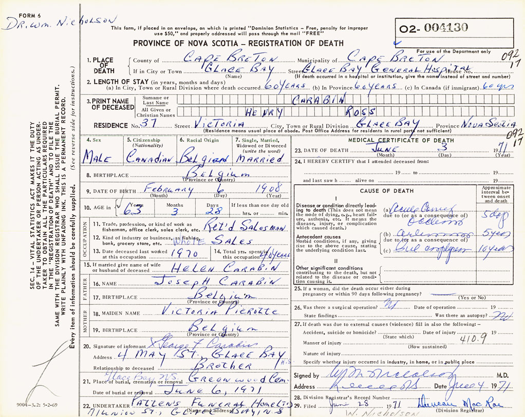 1. PLACE OF DEATH County of Cape Breton If in City or Town Glace Bay