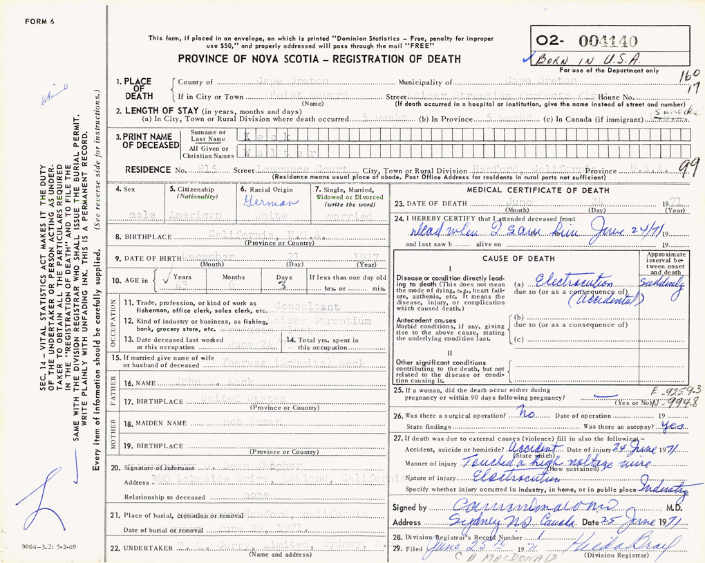 PROVINCE OF NOVA SCOTIA — REGISTRATION OF DEATH