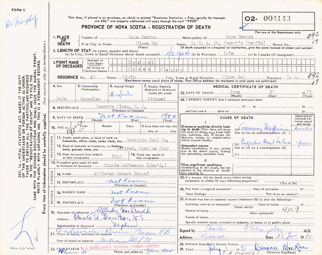 1. PLACE OF DEATH County of Cape Breton If in City or Town Glace Bay
