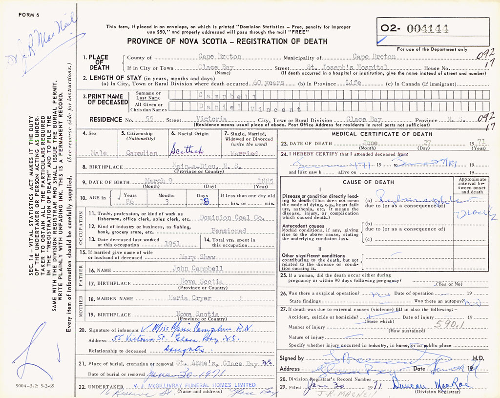 1. PLACE OF DEATH County of Cape Breton If in City or Town Glace Bay