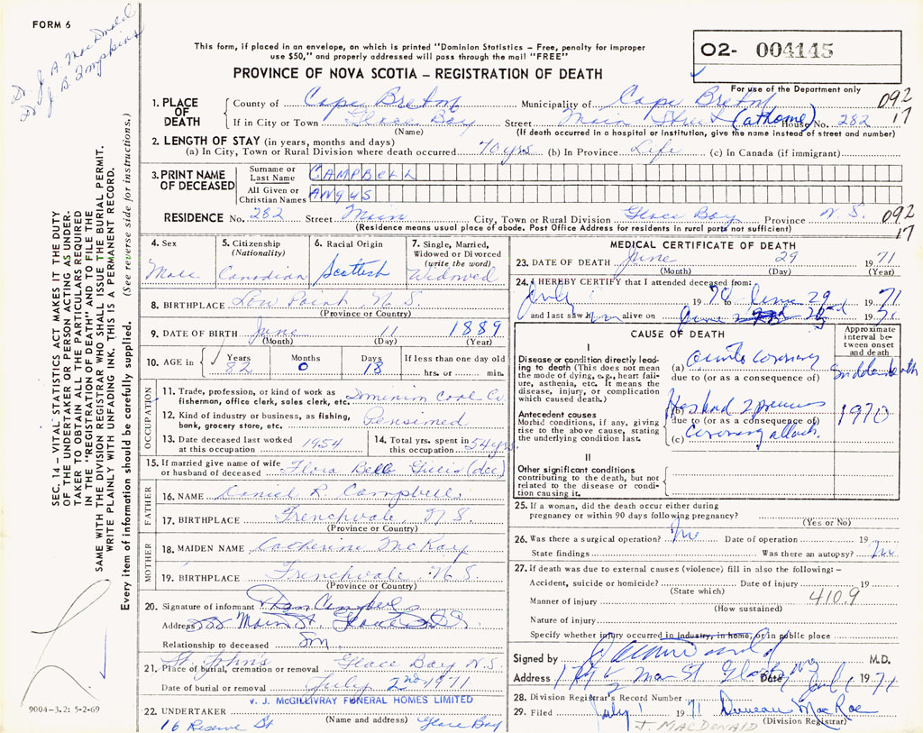 1. PLACE OF DEATH County of Cape Breton If in City or Town Glace Bay