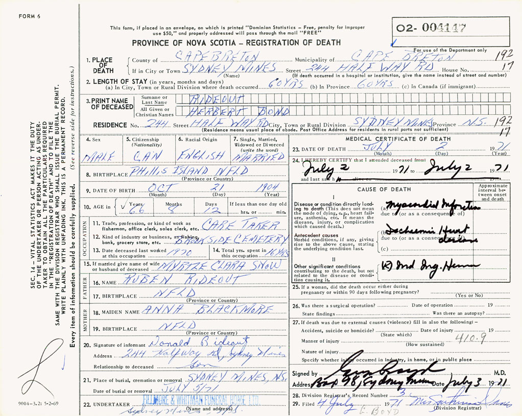 1. PLACE OF DEATH County of Cape Breton If in City or Town Sydney Mines
