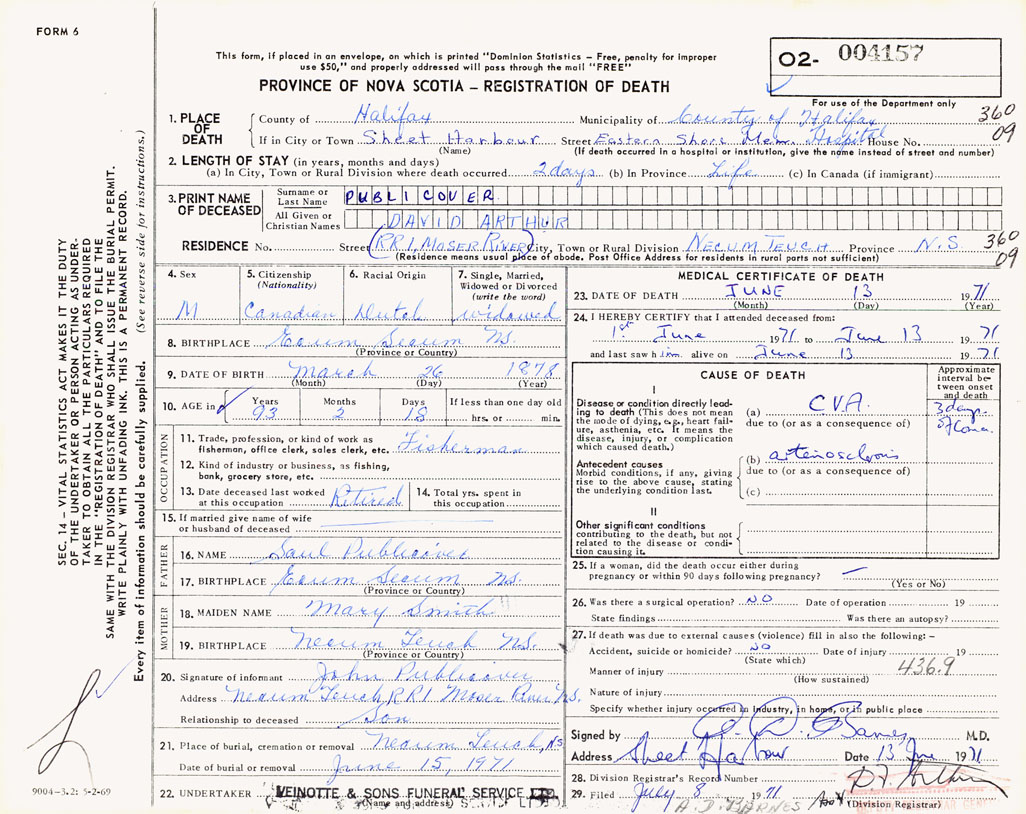 PROVINCE OF NOVA SCOTIA — REGISTRATION OF DEATH