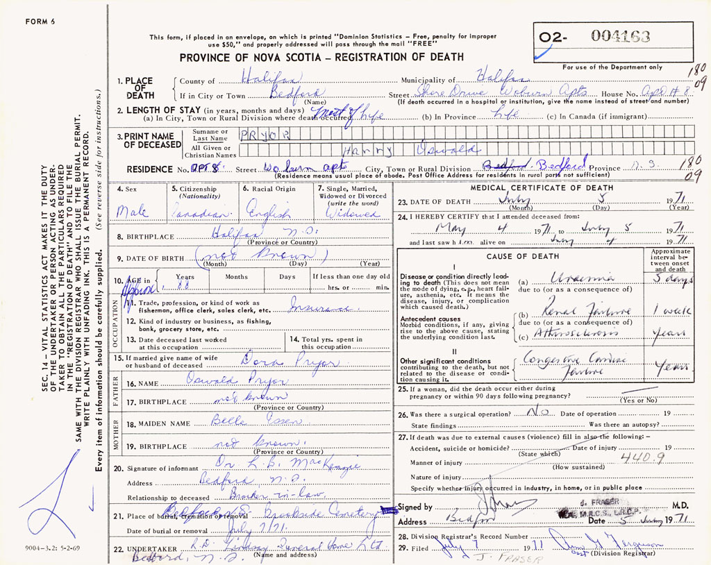 PROVINCE OF NOVA SCOTIA — REGISTRATION OF DEATH