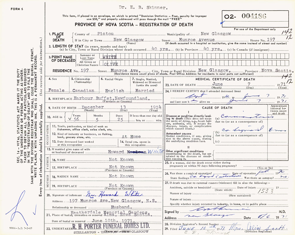 PROVINCE OF NOVA SCOTIA — REGISTRATION OF DEATH