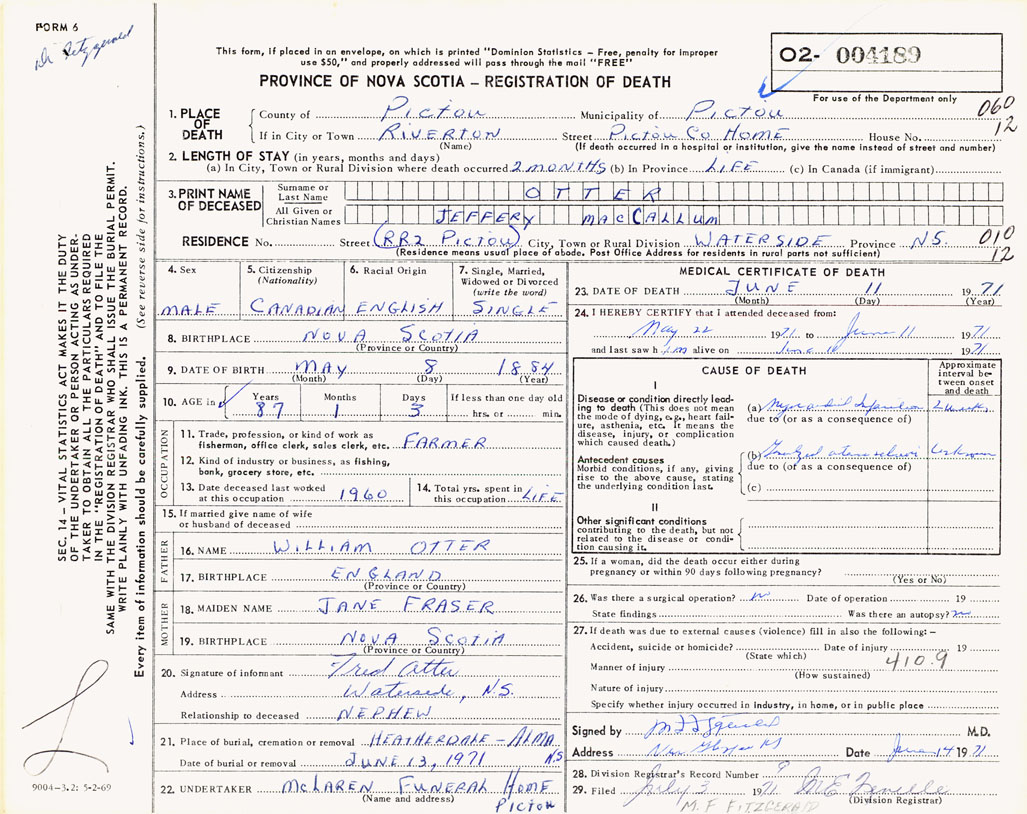 PROVINCE OF NOVA SCOTIA — REGISTRATION OF DEATH