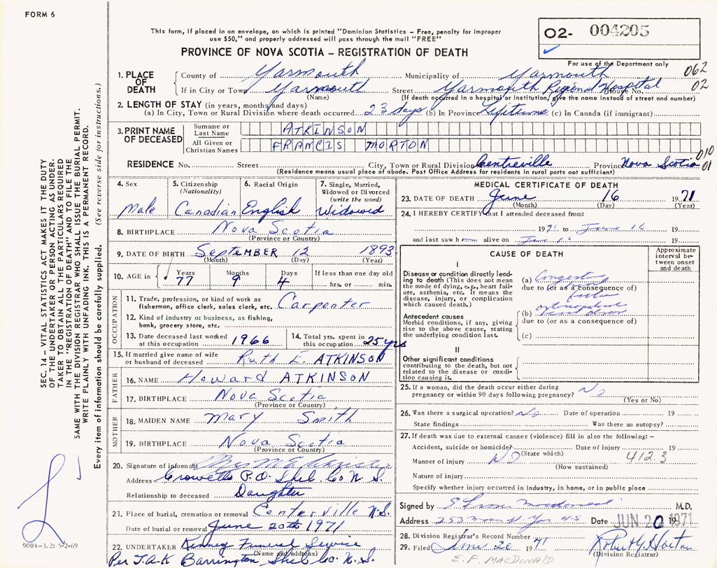 PROVINCE OF NOVA SCOTIA — REGISTRATION OF DEATH
