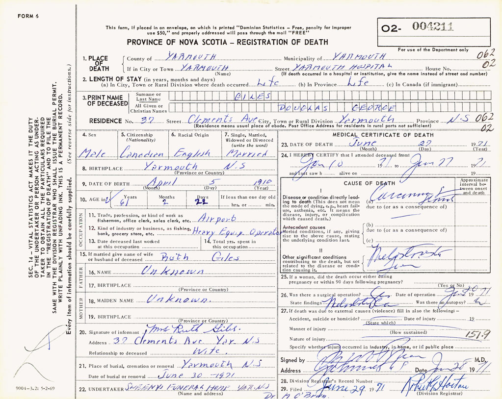 PROVINCE OF NOVA SCOTIA — REGISTRATION OF DEATH