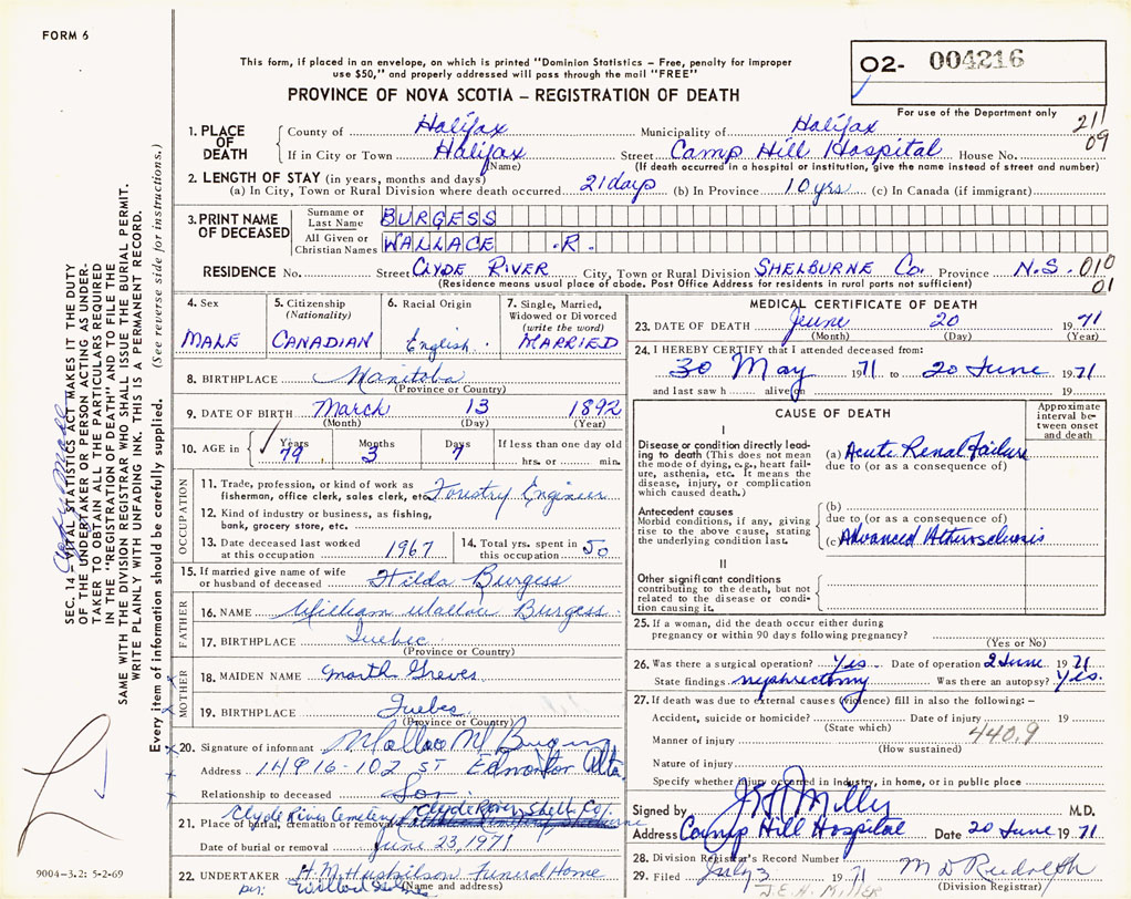 PROVINCE OF NOVA SCOTIA — REGISTRATION OF DEATH