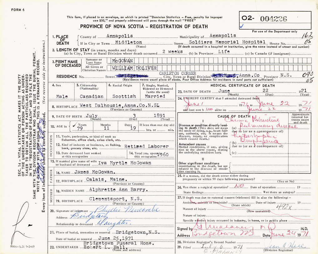 PROVINCE OF NOVA SCOTIA — REGISTRATION OF DEATH