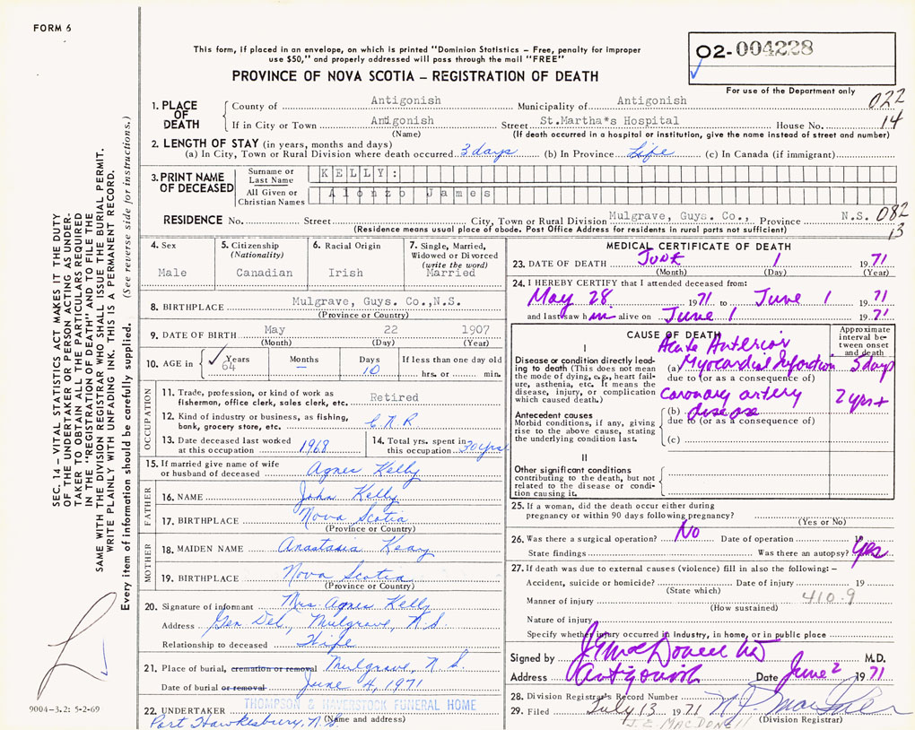 PROVINCE OF NOVA SCOTIA — REGISTRATION OF DEATH