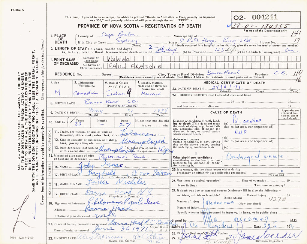 PROVINCE OF NOVA SCOTIA — REGISTRATION OF DEATH