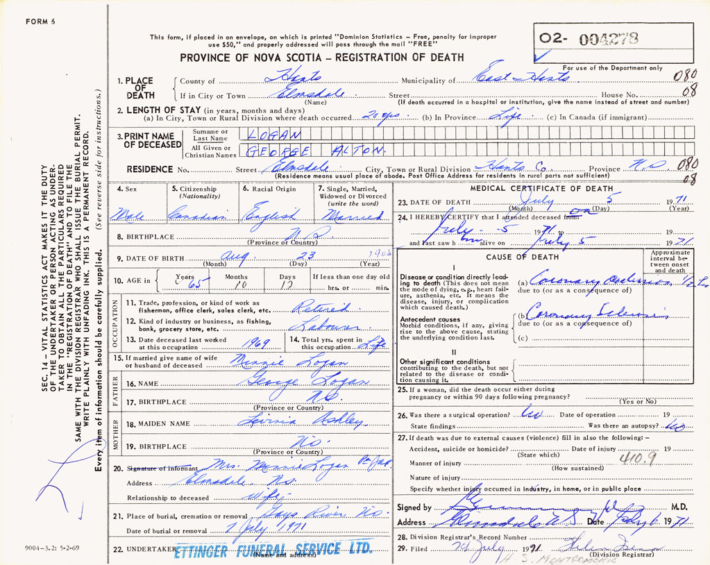 PROVINCE OF NOVA SCOTIA — REGISTRATION OF DEATH