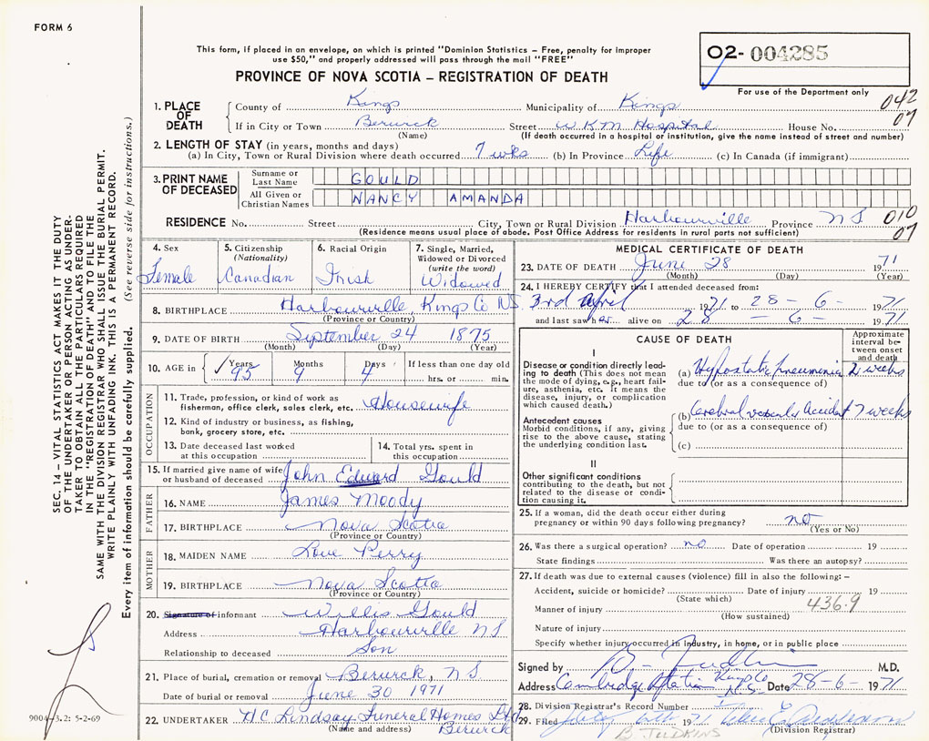 PROVINCE OF NOVA SCOTIA — REGISTRATION OF DEATH