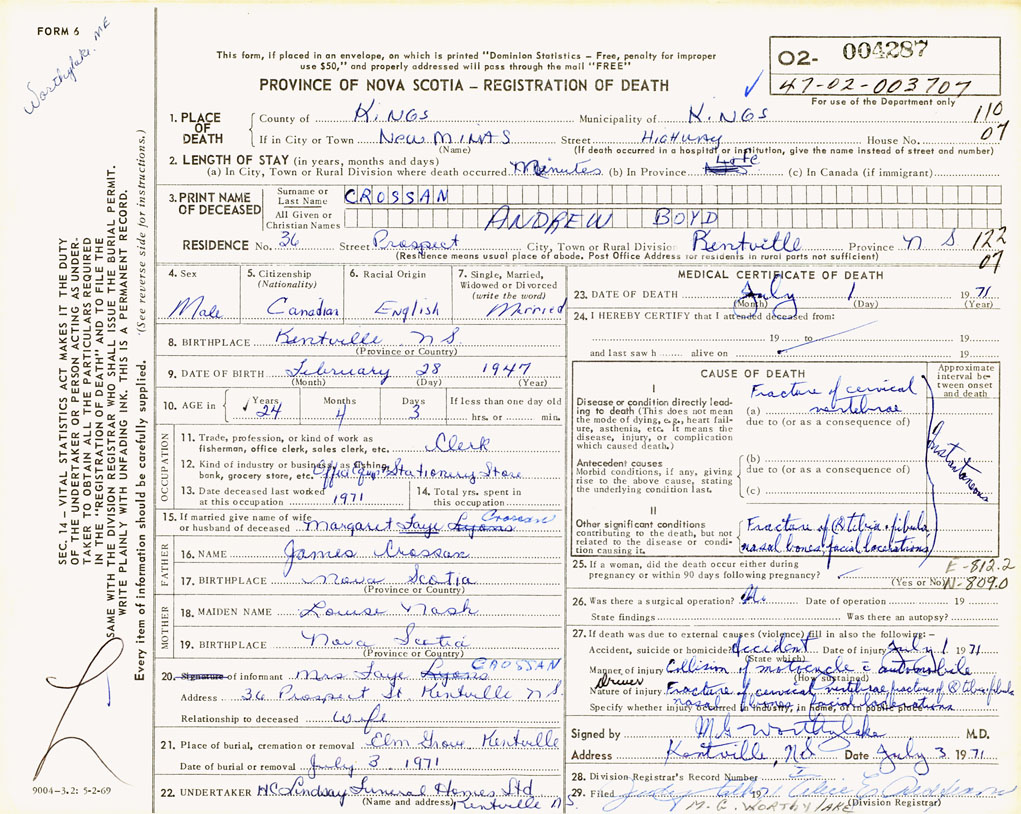 PROVINCE OF NOVA SCOTIA — REGISTRATION OF DEATH