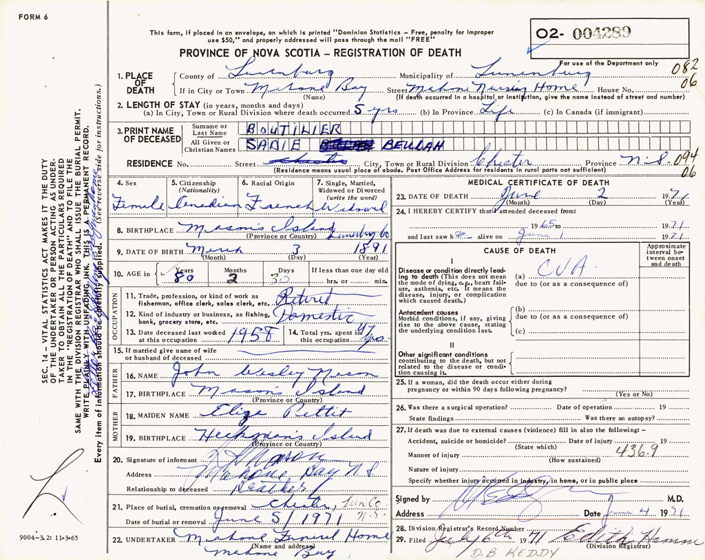 1. PLACE OF DEATH County of Lunenburg If in City or Town Mahone Bay