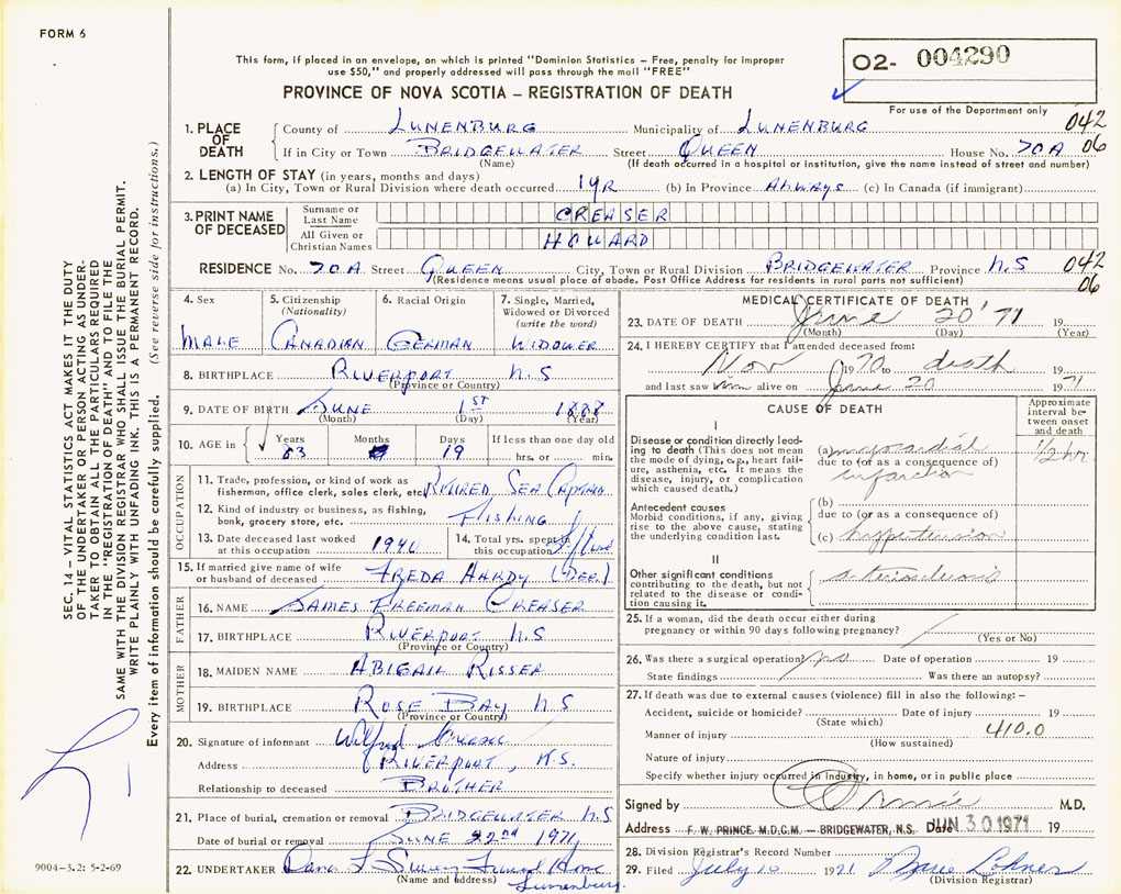PROVINCE OF NOVA SCOTIA — REGISTRATION OF DEATH