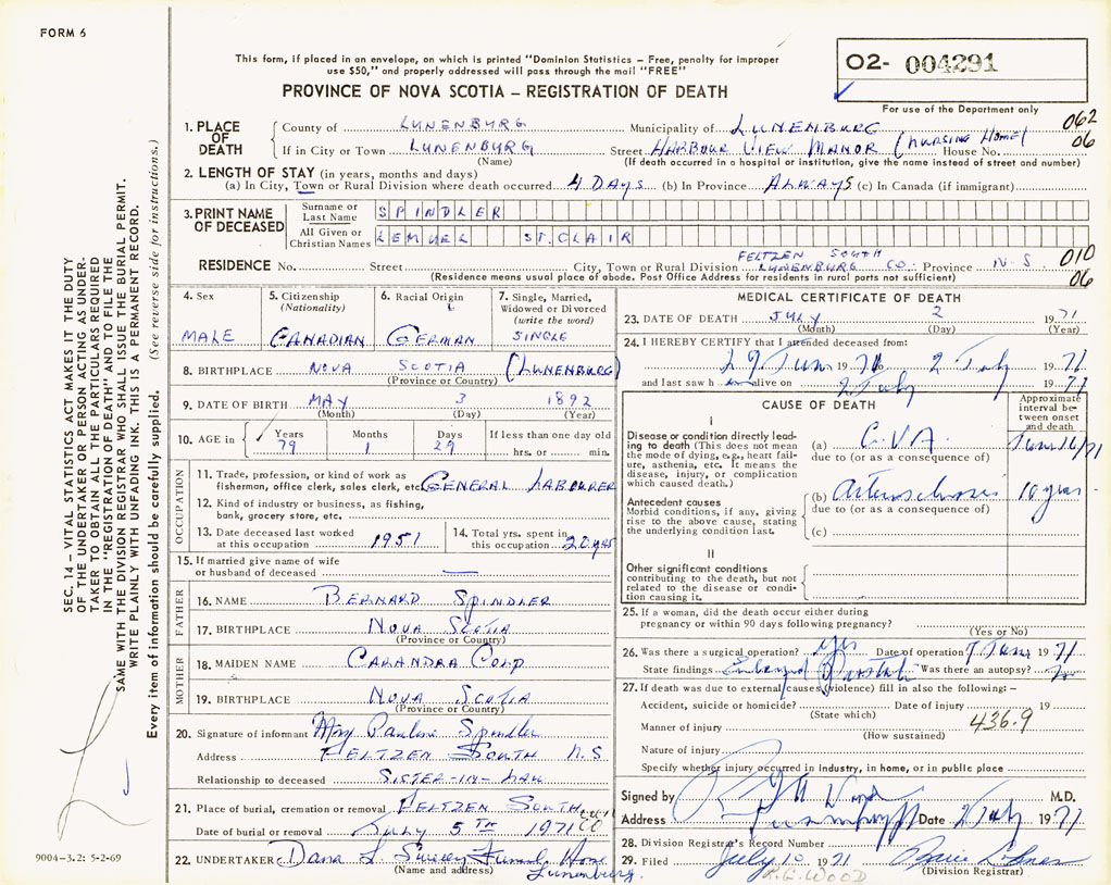PROVINCE OF NOVA SCOTIA — REGISTRATION OF DEATH