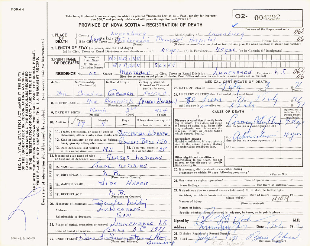 PROVINCE OF NOVA SCOTIA — REGISTRATION OF DEATH