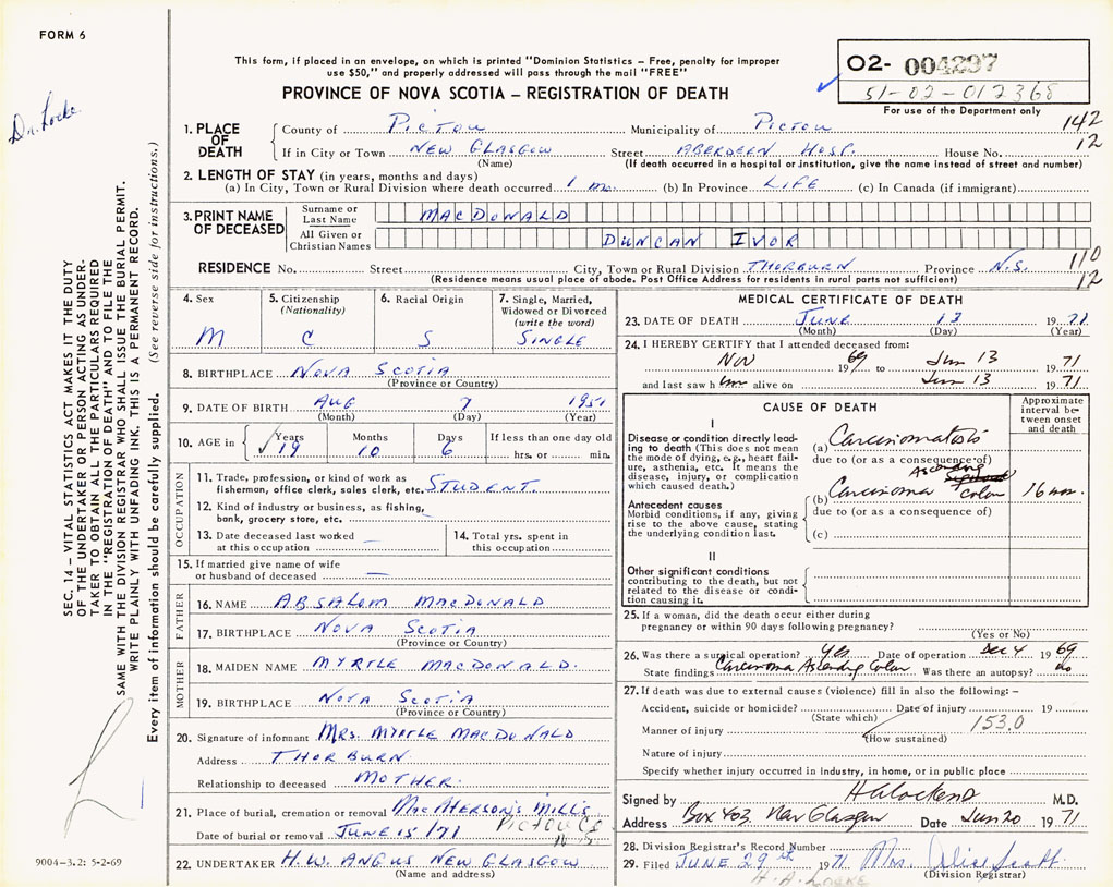 1. PLACE OF DEATH County of Pictou If in City or Town New Glasgow