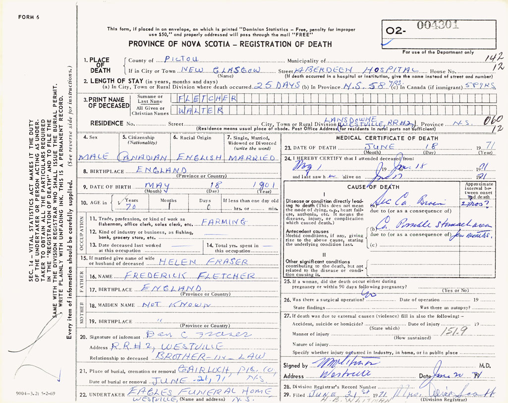 1. PLACE OF DEATH County of Pictou If in City or Town New Glasgow
