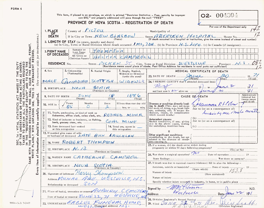 1. PLACE OF DEATH County of Pictou If in City or Town New Glasgow