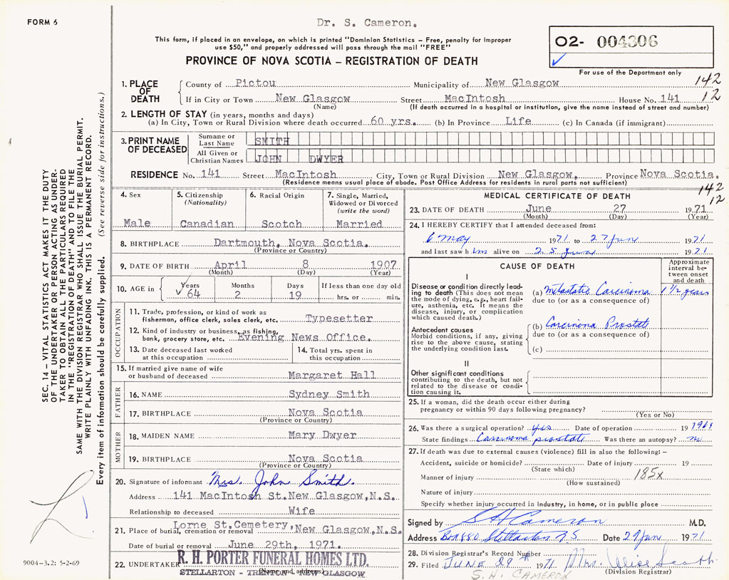 PROVINCE OF NOVA SCOTIA — REGISTRATION OF DEATH