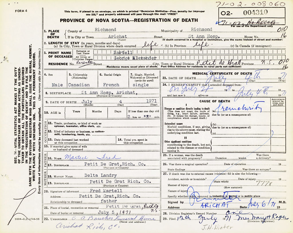 19. BIRTHPLACE Petit de Grat, Rich. Co., NS