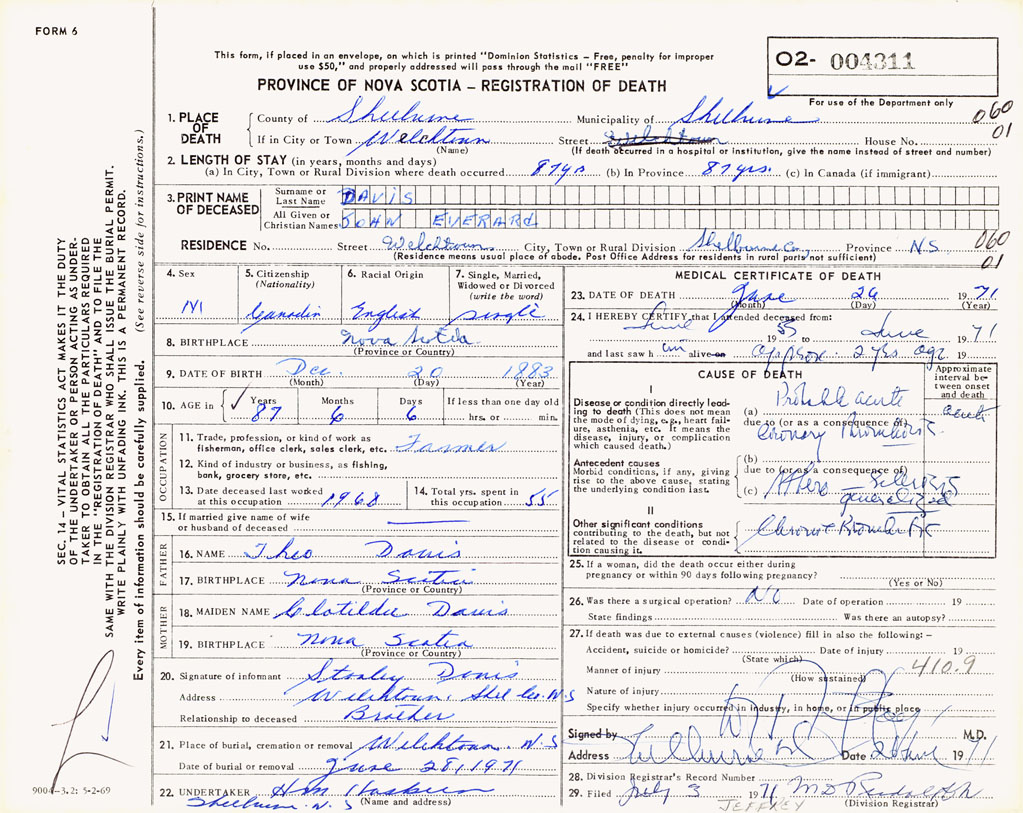 PROVINCE OF NOVA SCOTIA — REGISTRATION OF DEATH