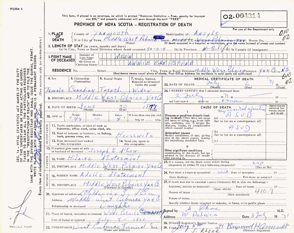 1. PLACE OF DEATH County of Yarmouth If in City or Town Middle West Pubnico