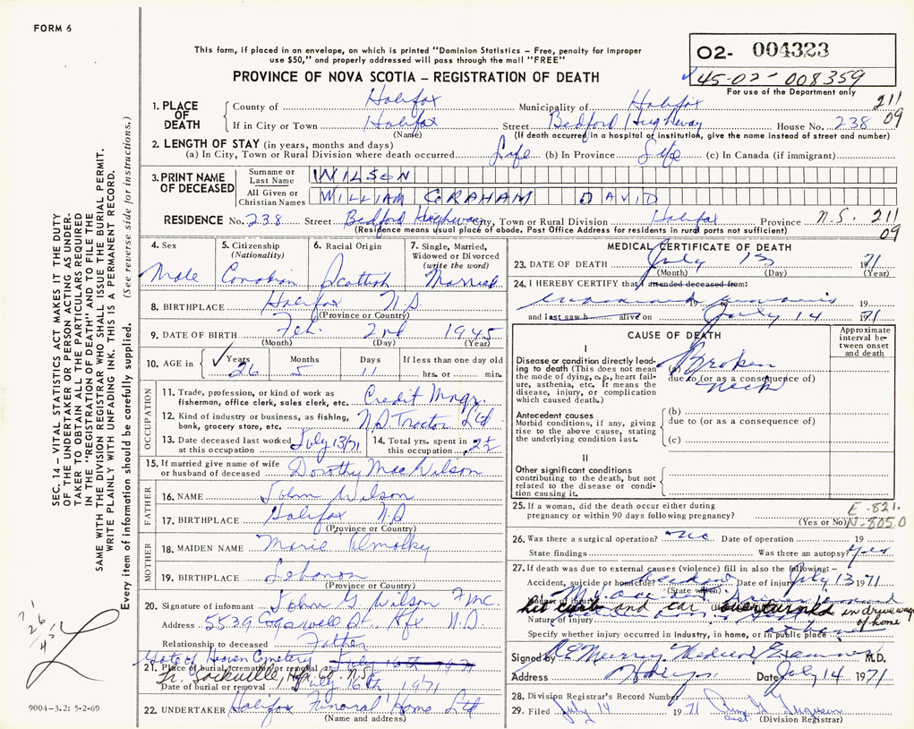 PROVINCE OF NOVA SCOTIA — REGISTRATION OF DEATH