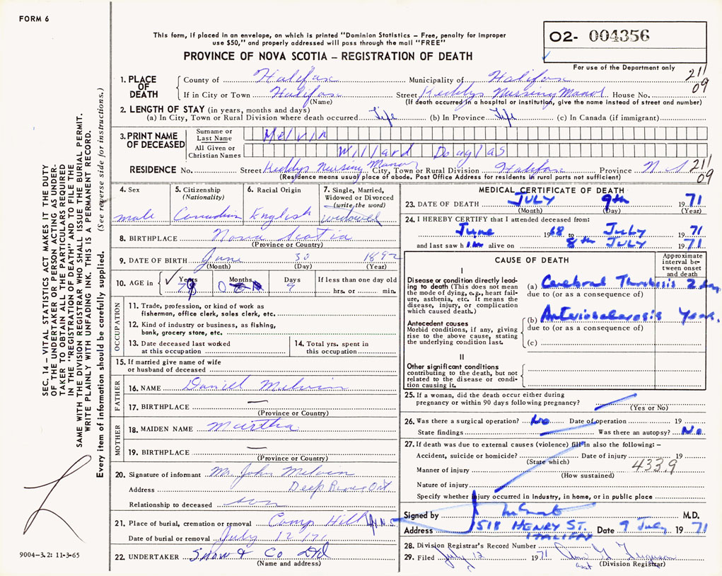 PROVINCE OF NOVA SCOTIA — REGISTRATION OF DEATH