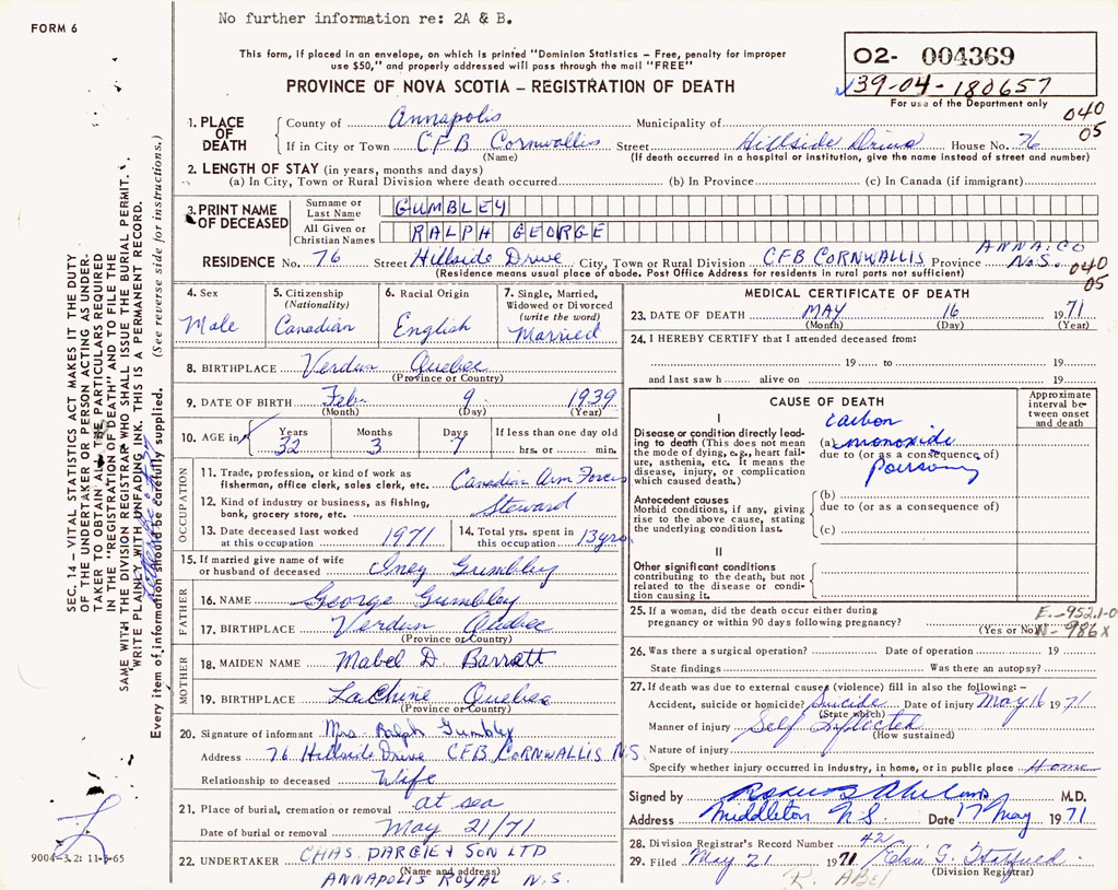 PROVINCE OF NOVA SCOTIA — REGISTRATION OF DEATH