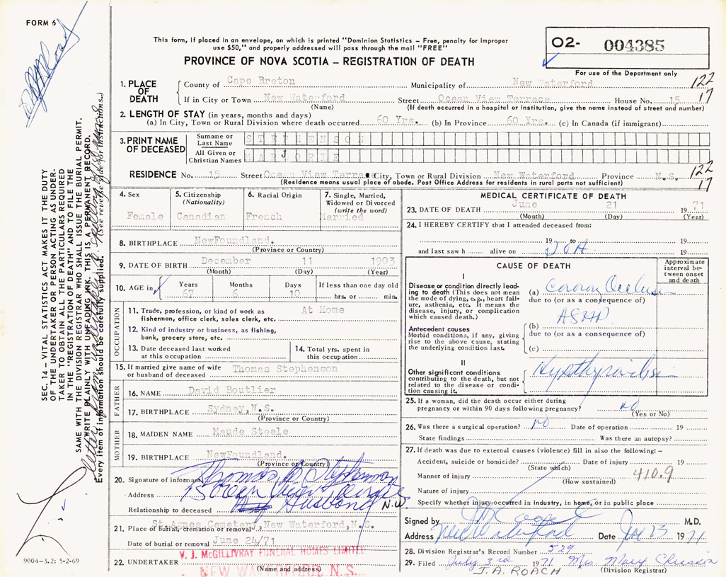 21. Place of burial St. Agnes Cemetery, New Waterford, NS