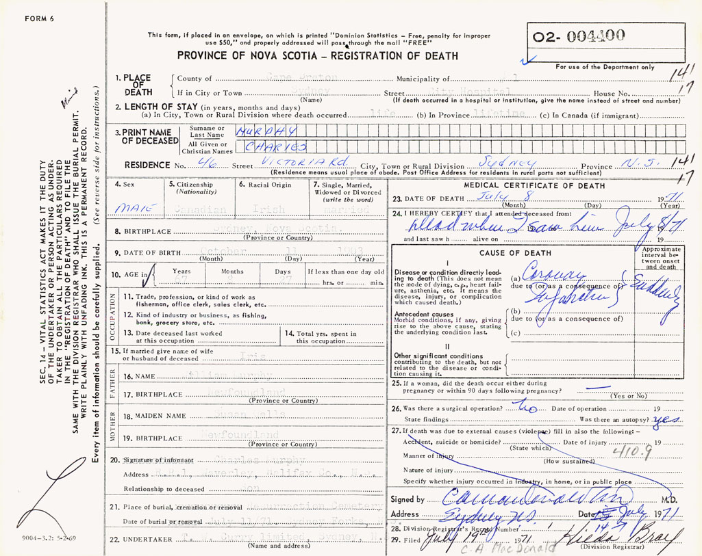 PROVINCE OF NOVA SCOTIA — REGISTRATION OF DEATH