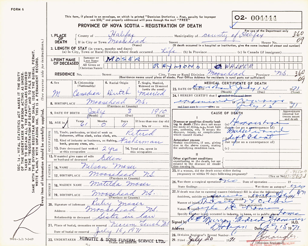 PROVINCE OF NOVA SCOTIA — REGISTRATION OF DEATH