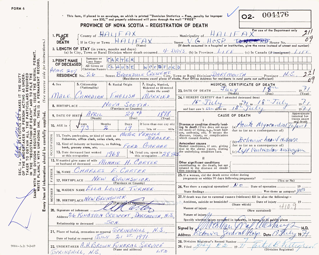 PROVINCE OF NOVA SCOTIA — REGISTRATION OF DEATH